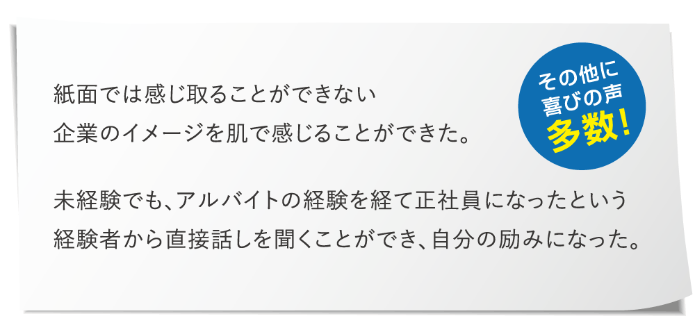 - 各企業の雰囲気や社風を知ることができ、具体的に自分の働きたいビジョンを見直すことができたのでよかったです。